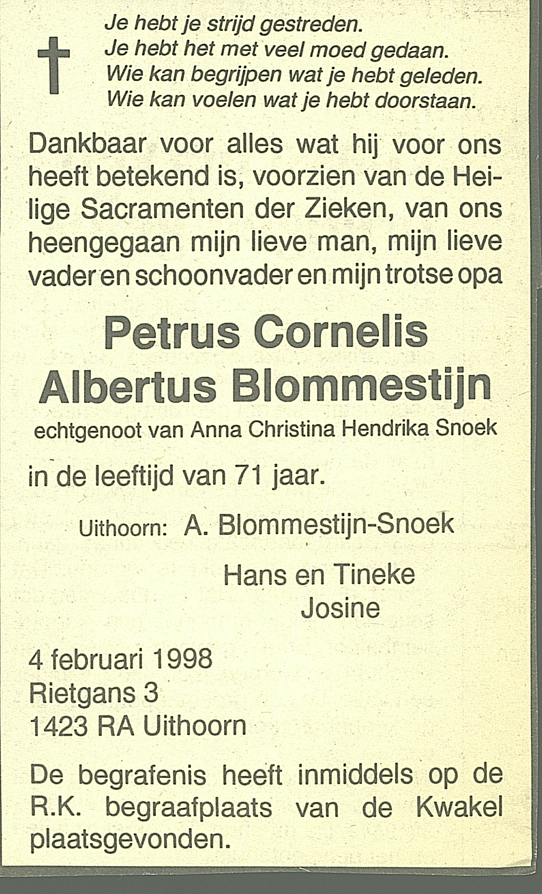 Petrus Cornelis Albertus Blommestijn overlijden