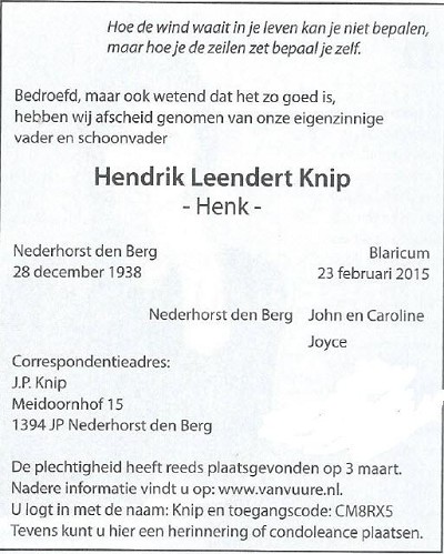 Hendrik Leendert Knip overlijden