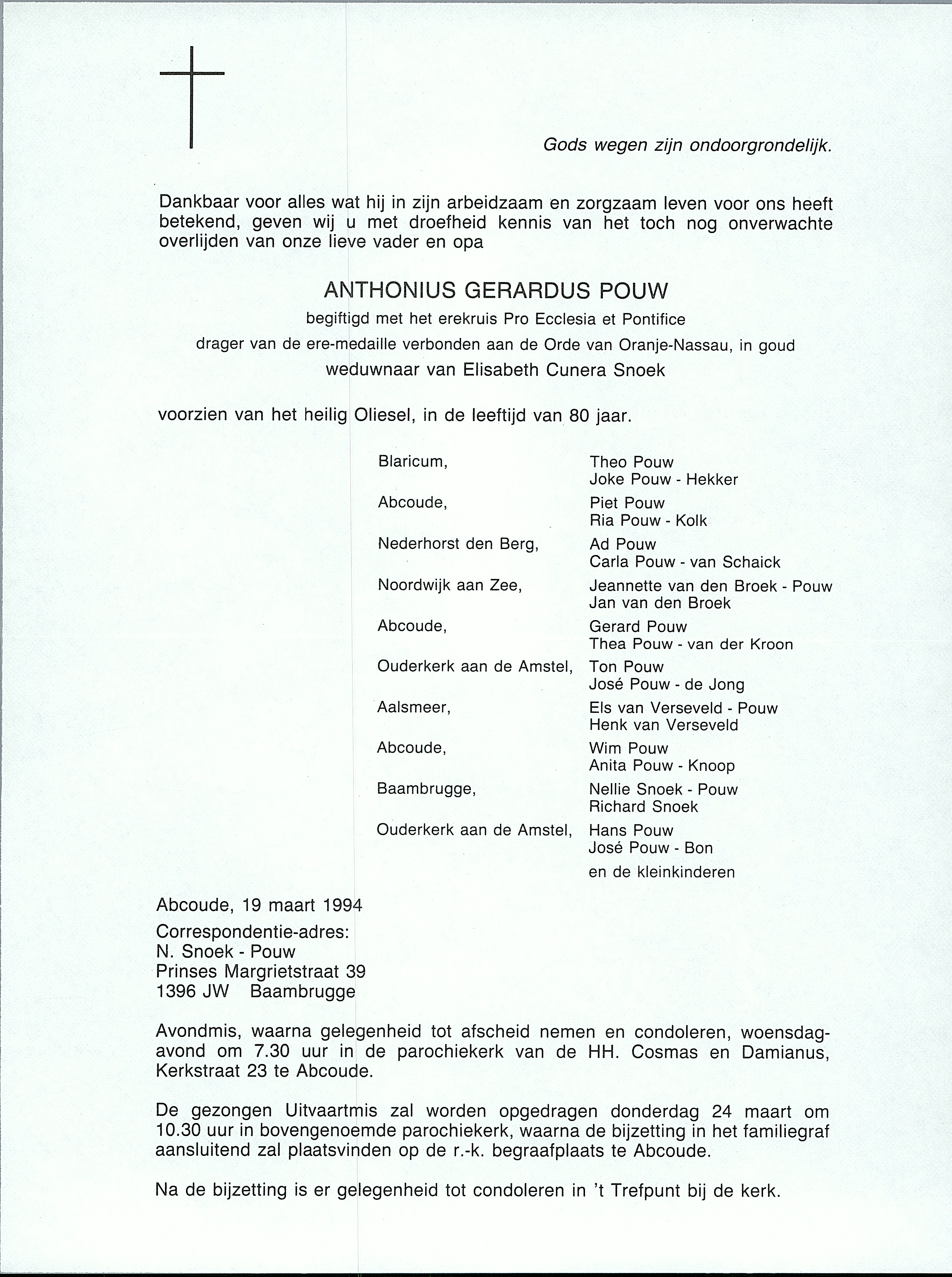 Anthonius Gerardus Pouw overlijden
