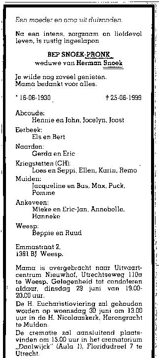 Gijsbertha Maria Pronk overlijden