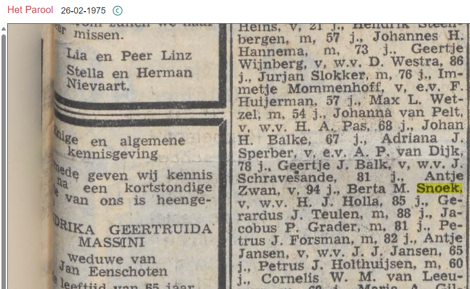 Berta Maria Snoek overlijden